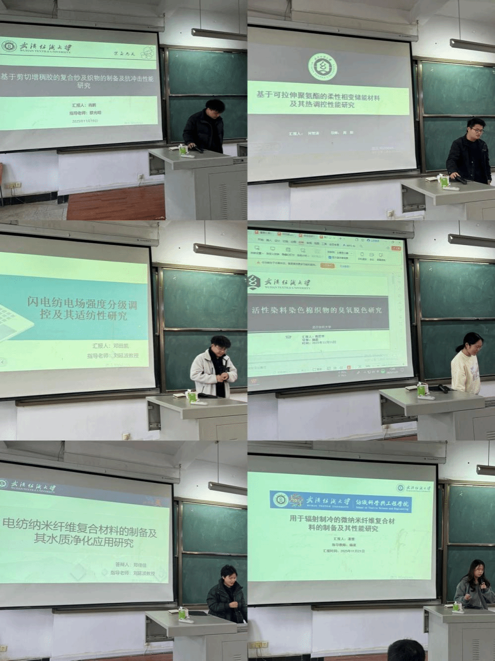 论坛上,邓田凯、郑佳佳、陈思琴、潘慧、何智涛、肖鹏六位同学依次介绍了自己的研究课题和目前取得的研究进展,并分享了自己的科研经验。主讲同学的研究课题包括闪电纺丝过程中电场强度分级调控及其适纺性研究、电纺纳米纤维复合材料的制备及其水质净化应用研究、活性染料染色棉织物的臭氧脱色研究、用于辐射制冷的微纳米纤维复合材料的制备及其性能研究、基于可拉伸聚氨酯的柔性相变储能材料及其热调控性性能研究、基于剪切增稠剂的复合纱及织物制备与抗冲击性能研究,契合了“纺织新材料及绿色加工”主题,代表了海角网
