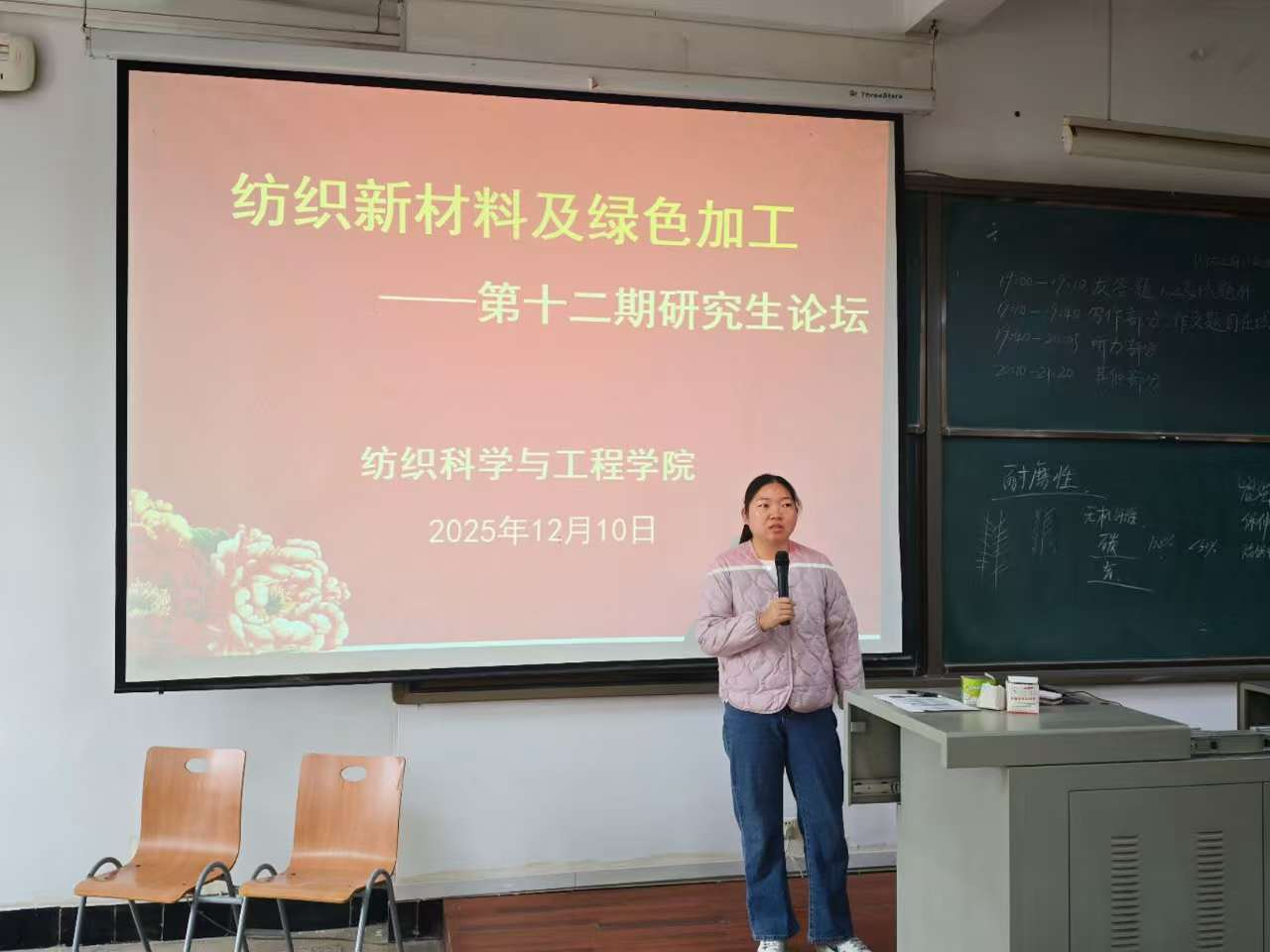 的科研工作,加强师生间的学术交流,提高研究生素质和学术氛围,海角网于12月10日下午14:30举办了第十二期“纺织新材料及绿色加工”研究生论坛。