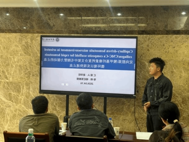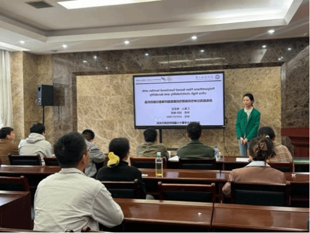 本次论坛汇聚 6 位博士研究生,围绕纺织科学、材料工程、生物医用等前沿方向开展学术汇报:齐杭杭分享酶法剥皮调控苎麻纤维结构研究进展;赵华旺介绍定向胶原 / CMC-Ca 复合支架在快速止血领域的应用;尚路路阐述分级液流纺丝制备透气高抗冲击 STF 基 TENG 的智能防护应用;施雯雯展示超高拉伸、耐用透明聚氨酯纤维基光致发光智能纺织品;胡泽馗解析主盐浓度与沉积时间对 GCr15 钢表面 Ni-B-Mo 化学镀层的影响;陈钰莹汇报强韧、粘附、高透明、防冻 PVA 水凝胶在应变传感器中的研究。每位选手在 8 分钟内,清晰阐述课题背景、核心内容、创新亮点与未来规划,展现出扎实的科研素养与前沿视野。