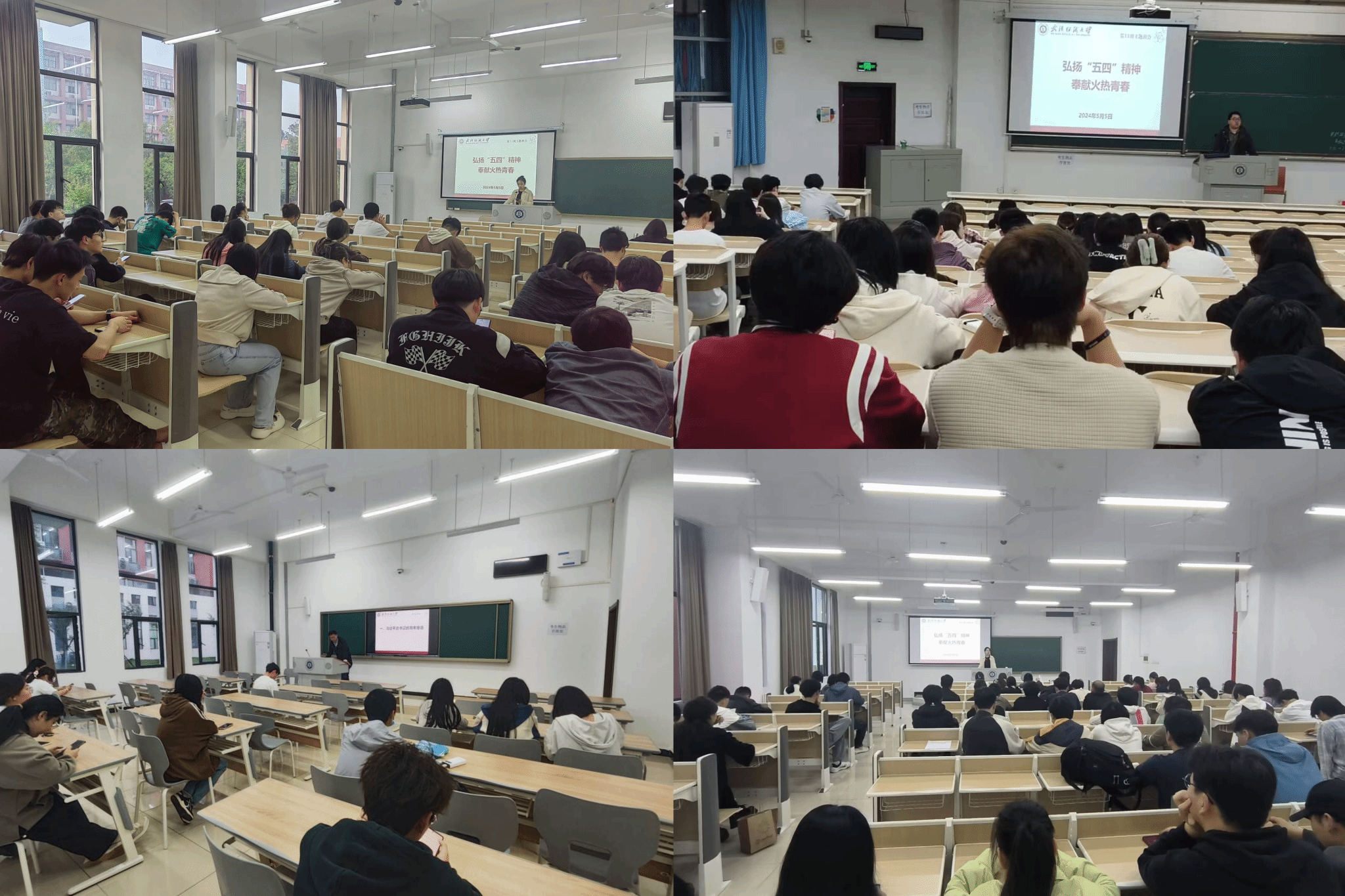 于5月5日开展“弘扬‘五四’精神,奉献火热青春”主题班会。本次主题班会由各年级辅导员、班主任主持,各年级学生共同参与。