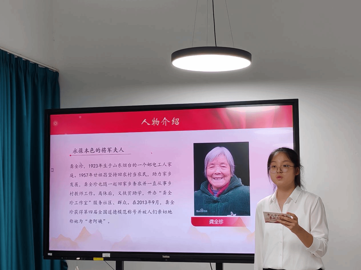 纺织工程专业学生第二党支部党员代表李杨讲述道,她正走在纺织文化传承与创新的领航路上,以龚全珍精神为指引,用实际行动彰显新时代纺大学子的责任与担当。